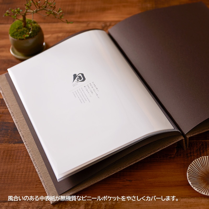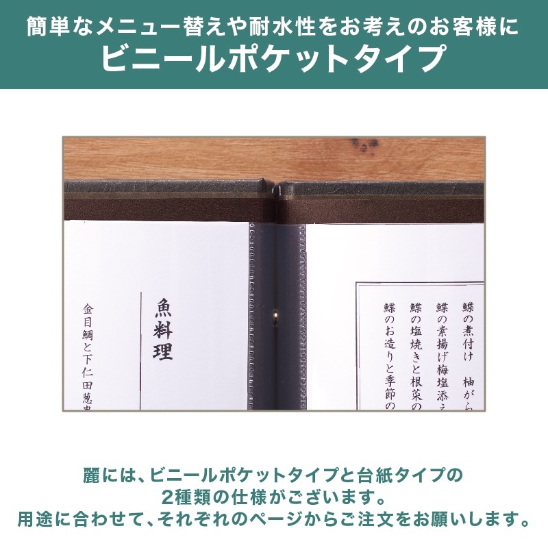 高級感漂う「台紙タイプ」と、機能性に優れた「ビニールポケットタイプ」2種類をご用意。A4用紙に対応した、これまでにない大型仕様です。