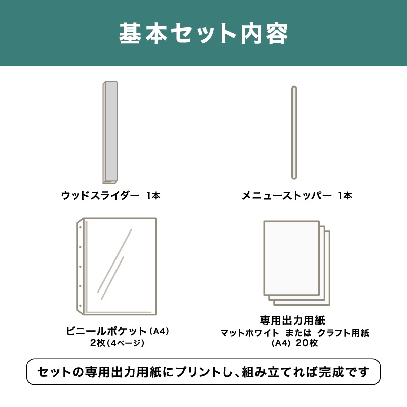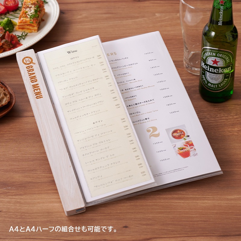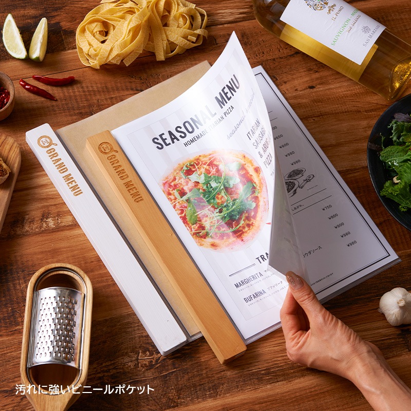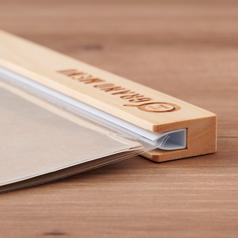 「便利だけど味気ない」を解消したレール式のメニューブックです。ナチュラルなデザインで、多くの飲食店でご好評いただいている人気商品!