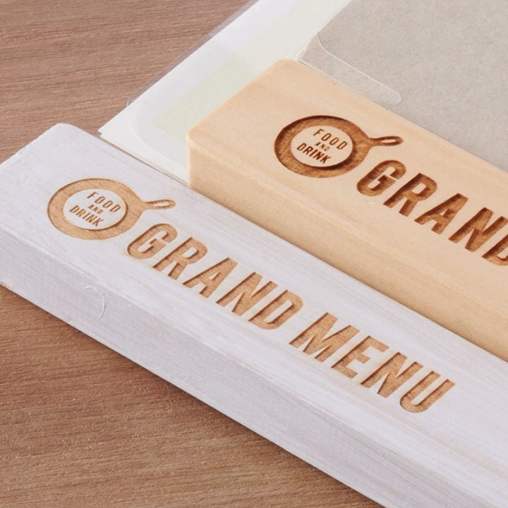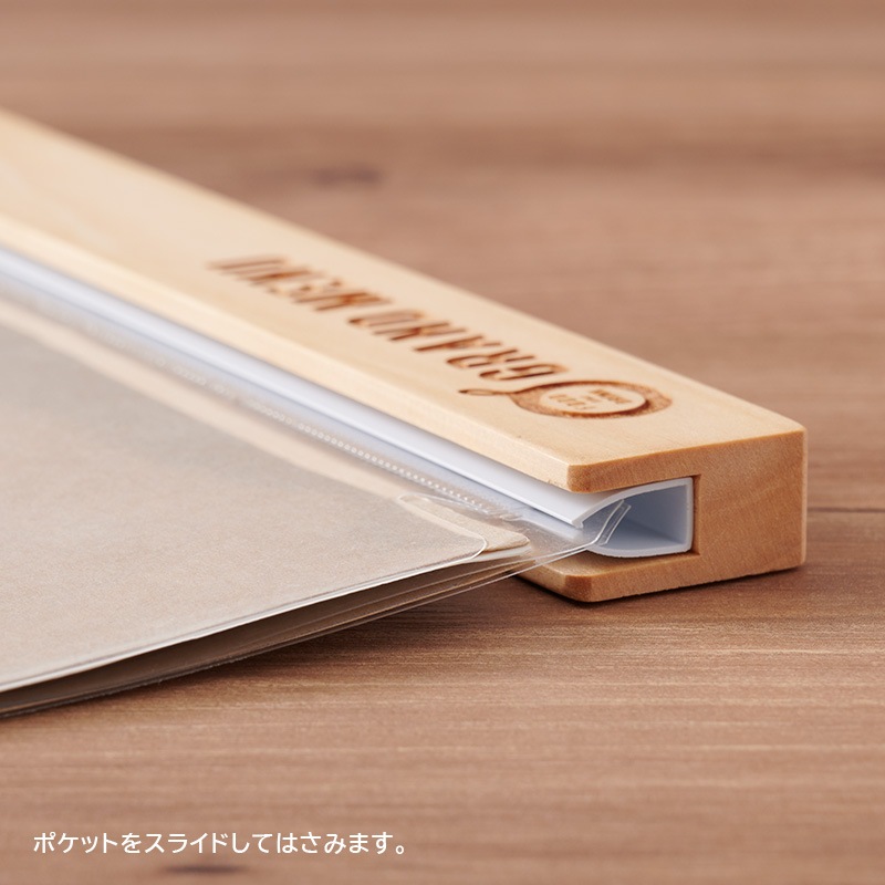 高知県産天然木「銀杏」の端材を有効活用し、無機質になりがちなビニールポケットのメニューを、木の温もりを感じる1冊に仕上げました。