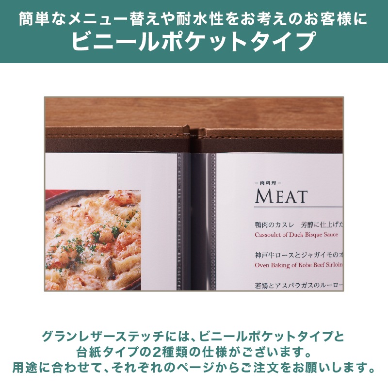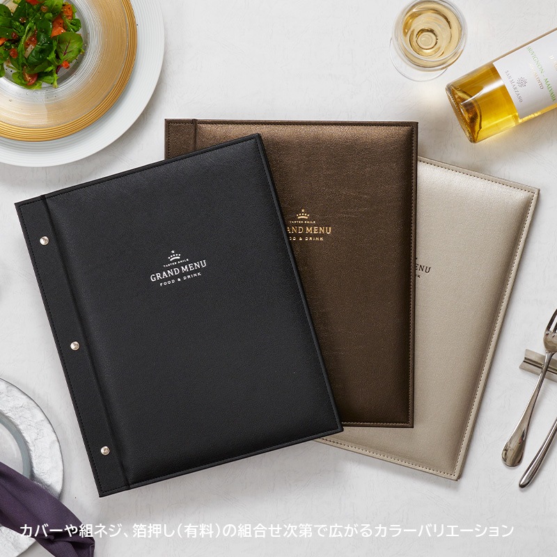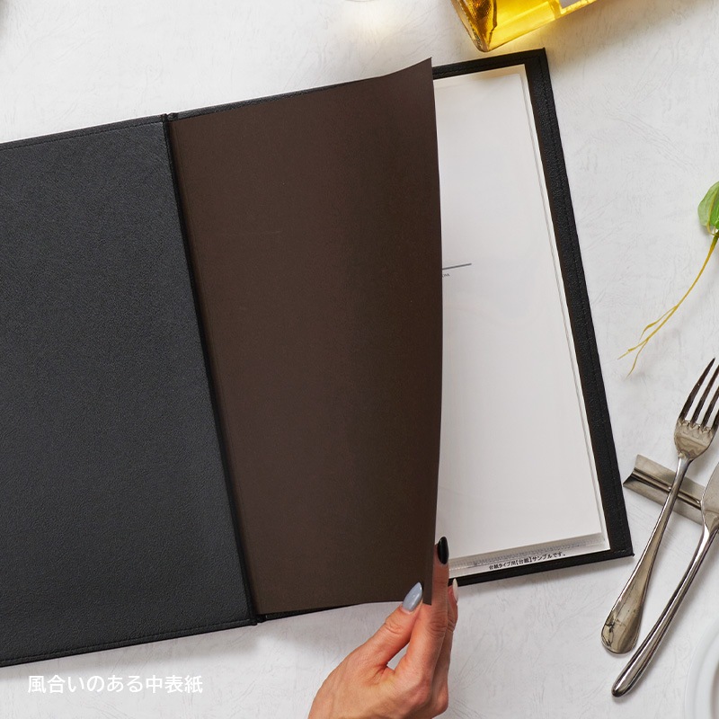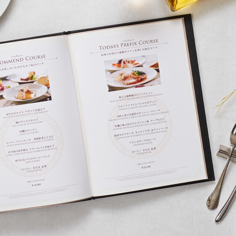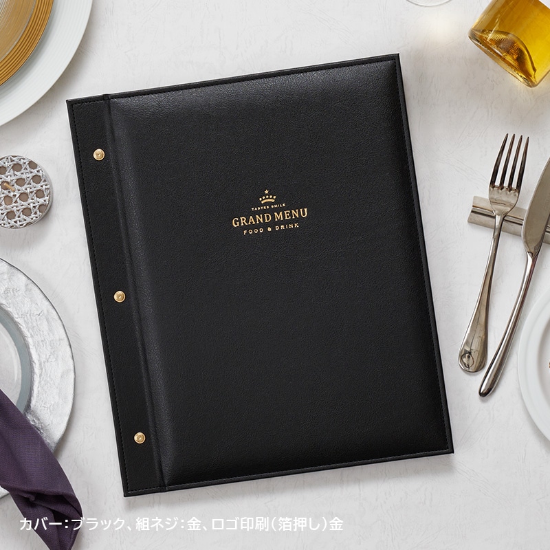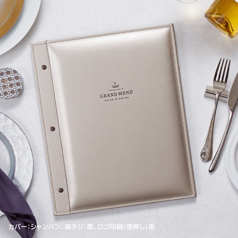 光沢と優美な質感の合皮素材にステッチを施し、ダイナミックなサイズ感で仕上げました。華やかな食空間をラグジュアリーに演出するメニューブックです。