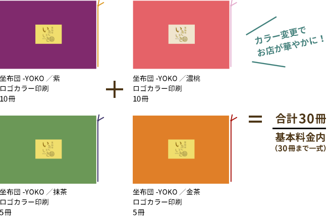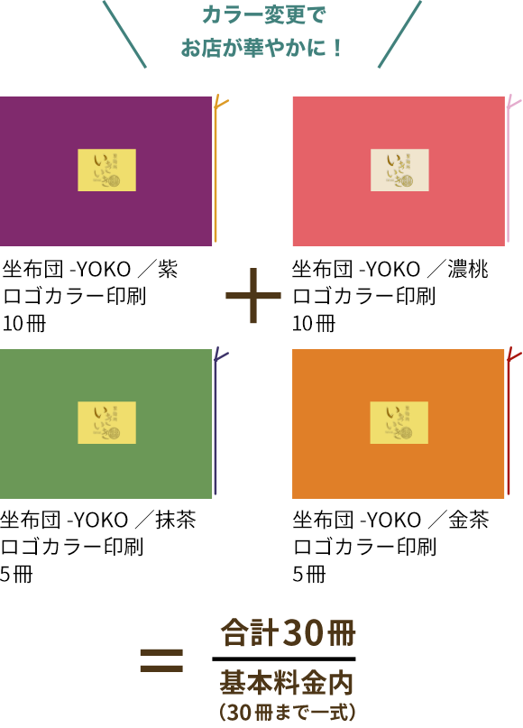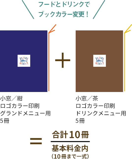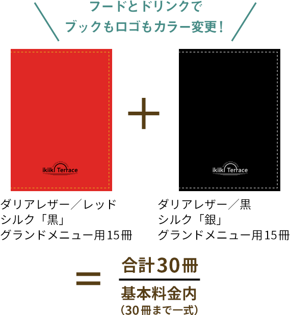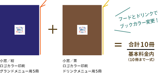 同時印刷の場合、同じ版を利用して、ロゴやメニューブックのカラーチェンジも基本料金で承っております。